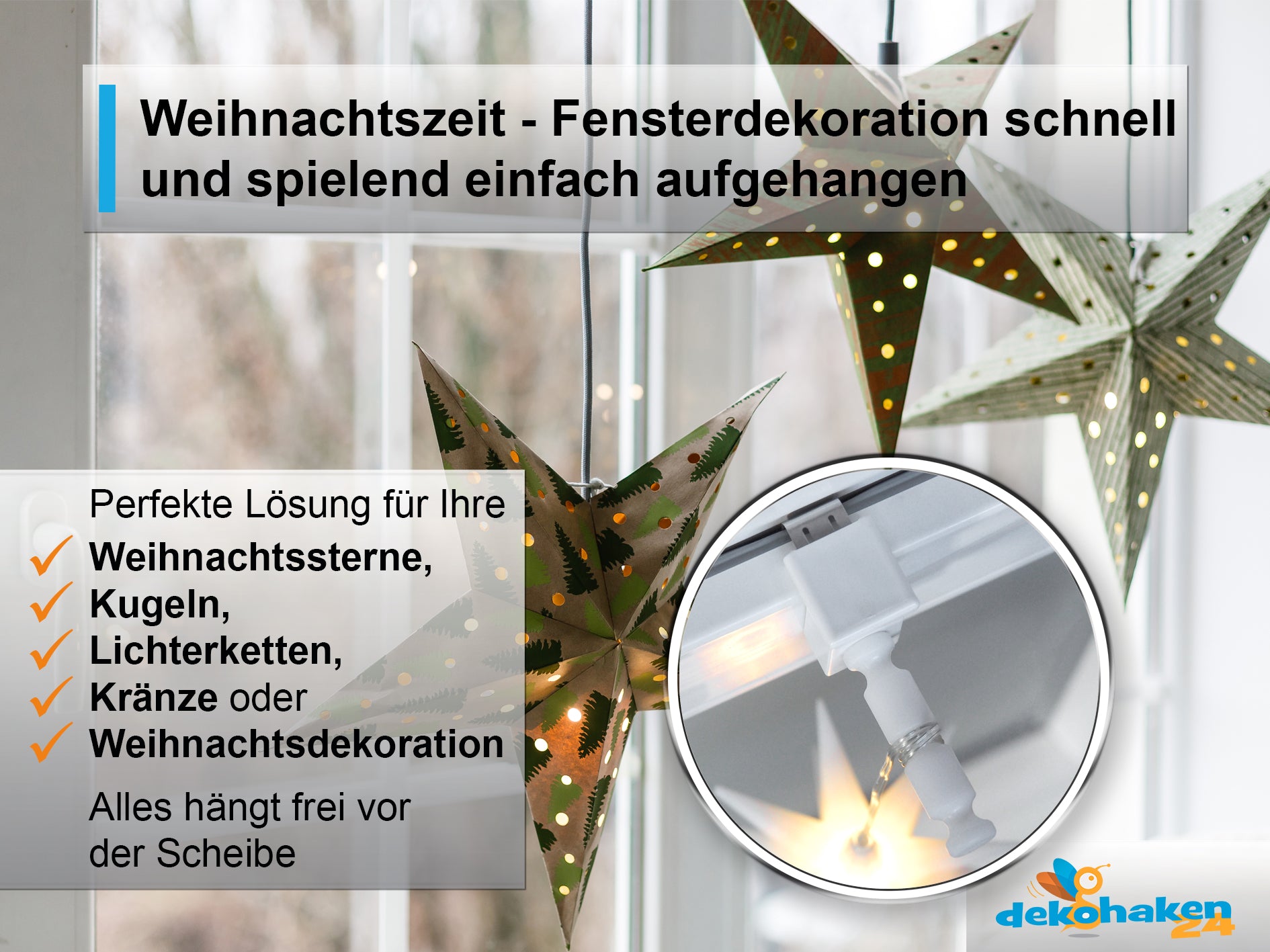 - Hängende Dekorationsartikel haben oft ein bestimmtes Volumen. Damit diese frei hängend und schwingend angebracht werden können, wird ein Fensterhaken mit Distanzhalter benötig. Ihre Dekoartikel hängen frei vor der Scheibe.