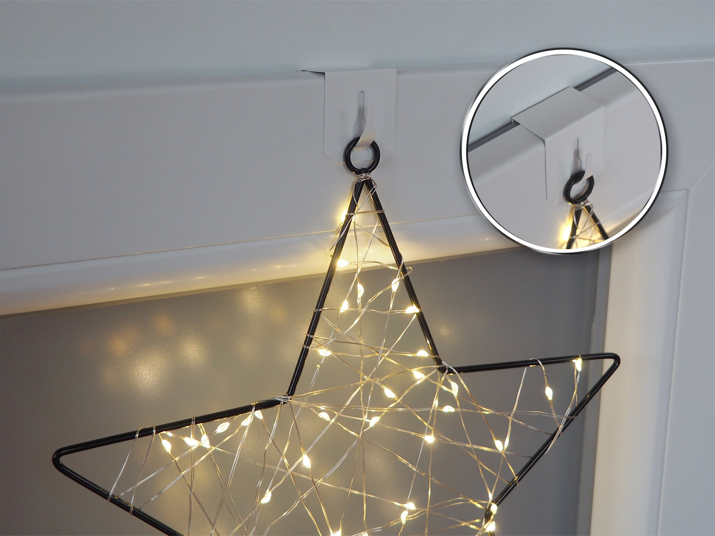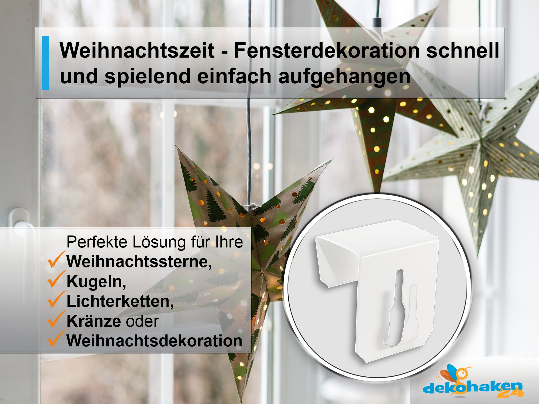 Perfekt für die Weihnachtszeit. Einfaches Aufhängen von Weihnachtssternen, leichten Kränzen, Kugeln oder Fensterbildern. Werden mehrere Haken an einem Fenster befestigt, bieten diese optimalen Halt für Lichterketten oder Lichtervorhänge. Kein Ärger mehr mit abfallenden Klebehaken oder sich lösenden Saugnäpfen. Immer wieder ohne Rückstände zu entfernen und wiederzuverwenden.